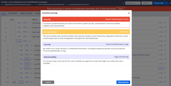 Die Guardrails von Pega enthalten Best Practices für Sicherheit und Compliance und stellen sicher, dass Anwendungen unter Berücksichtigung von Sicherheitsaspekten entwickelt werden.Sie leiten Entwickler bei der Implementierung sicherer Authentifizierungsmechanismen, Datenverschlüsselung, Zugriffskontrollen und anderer Sicherheitsmaßnahmen. Durch die Einhaltung von Guardrails können Unternehmen gesetzliche Anforderungen erfüllen, sensible Daten schützen und Sicherheitsrisiken minimieren.