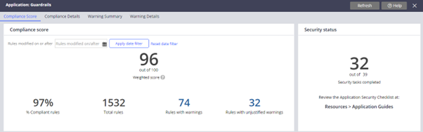 Die Guardrail-Übersicht bietet eine komfortable Möglichkeit, eine detaillierte Zusammenfassung einer Anwendung zu erhalten, die eine schnelle Bewertung der Compliance ermöglicht. Anhand dieser Übersicht kann leicht überprüft werden, ob alle Richtlinien korrekt berücksichtigt wurden